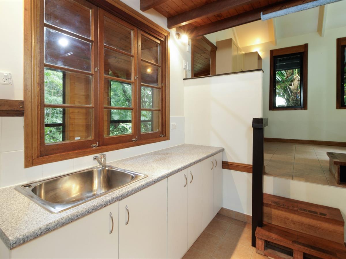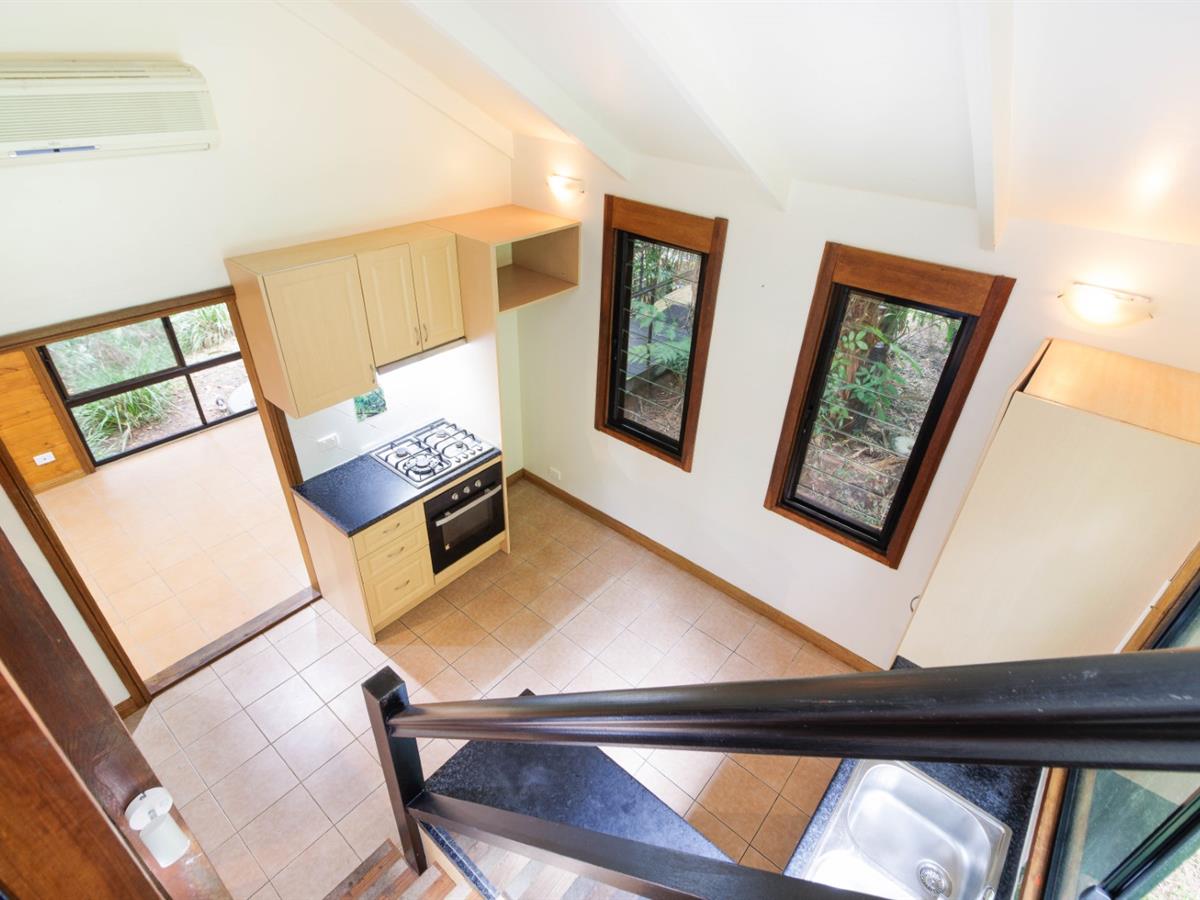 The split-level establishment is found by following a curved pathway leading onto a footbridge across into the tree house. The open plan design with kitchen, living and dining areas polished timber stairs leading up to the main bedroom with views on three sides into the rainforest.